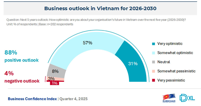 BCI ໃນໄຕມາດ IV/2025 ໄດ້ເພີ່ມຈາກ 13.5 ຄະແນນຂຶ້ນເປັນ 80.0 ຊື່ງໄດ້ສ່ອງແສງການປົວແປງຢ່າງຈະແຈ້ງ ແລະ ສະໝ່ຳສະເໝີ ນັບທັງໃນການຕີລາຄາຂອງວິສາຫະກິດ ເອີລົບ ກ່ຽວກັບເງື່ອໄນຂດຳເນີນທຸລະກິດຢູ່ ຫວຽດນາມ ໃນປະຈຸບັນ ກໍ່ຄືຄວາມຄາດຫວັງໃນໄລຍະຈະມາເຖິງ. 65% ວິສາຫະກິດຕີລາຄາວ່າ ສະພາບການດຳເນີນທຸລະກິດປະຈຸບັນແມ່ນຕັ້ງໜ້າ; ອັດຕານີ້ຈະເພີ່ມຂຶ້ນ 69% ໃນໄຕມາ I/2026, ຊື່ງສະແດງໃຫ້ເຫັນຄວາມປະເອີບໃຈສືບຕໍ່ໄດ້ຮັບການປັບປຸງເມື່ອກ້າວເຂົ້າສູ່ປີໃໝ່. ບົດລາຍງານຍັງຮັບຮູ້ວ່າ 65% ວິສາຫະກິດ ເອີລົບໄດ້ຕີລາຄາຢ່າງຕັ້ງໜ້າ, ສະແດງໃຫ້ເຫັນປະສິດທິຜົນການເຄື່ອນໄຫວສູງກ່ວາຫຼາຍພໍສົມຄວນ ເມື່ອທຽວກັບການຄາດຄະເນໃນເບື້ອງຕົ້ນ.
