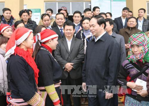 (vovworld) - ຕອນເຊົ້າວັນທີ 13/1, ທ່ານປະທານປະເທດ ເຈີ່ນດ້າຍກວາງ ພ້ອມກັບຄະນະປະຕິບັດງານໄດ້ລົງຢ້ຽມຢາມ, ມອບຂອງຂວັນໃຫ້ບັນດາຄອບຄົວນະໂຍບາຍ, ຄອບຄົວທຸກຍາກຢູ່ຕາແສງ ຢາຟູ (ເມືອງບ໋າວຖັງ) ແລະ ຕາແສງ ບ້ານຄວາງ (ເມືອງຊາປາ) ແຂວງລາວກາຍ. ນະທີ່ນີ້, ທ່ານປະທານປະເທດ ເຈີ່ນດ້າຍກວາງ ໄດ້ຢື້ຢາມຖາມຂ່າວ, ມອບຂອງຂວັນໃຫ້ 80 ຄອບຄົວນະໂຍບາຍ, ຄອບຄົວທຸກຍາກຢູ່ທີ່ນີ້. ທ່ານປະທານປະເທດ ເຈີ່ນດ້າຍກວາງ ຊົມເຊີຍອຳນາດການປົກຄອງທ້ອງຖິ່ນທຸກຂັ້ນໄດ້ເອົາໃຈໃສ່ເບິ່ງແຍງດູແລບຸນເຕັດໃຫ້ບັນດາເປົ້າໝາຍນະໂຍບາຍ, ຄອບຄົວທຸກຍາກ, ໃນຍາມບຸນເຕັດຮັບປະກັນໃຫ້ ທຸກໆຄອບຄົວຕ່າງໆກໍ່ໄດ້ຮັບບຸນເຕັດຢ່າງເບິກບານມ່ວນຊື່ນ, ປອດໄພ ແລະ ປະຢັດ.