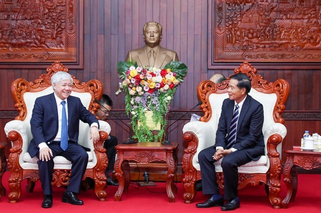 ທ່ານປະທານຄະນະກຳມະການສູນກາງແນວໂຮມປະເທດຊາດ ຫວຽດນາມ ໂດ້ວັນຈ໊ຽນ ພົບປະເຈລະຈາກັບທ່ານປະທານຄະນະກຳມະການແນວລາວສ້າງຊາດ ສິນລະວົງ ຄຸດໄພທູນ (ພາບ: ກວາງວິງ) |