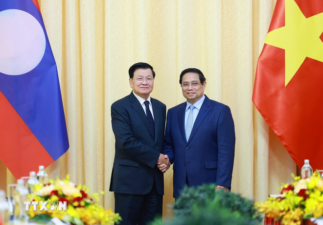 ທ່ານນາຍົກລັດຖະມົນຕີ ຫວຽດນາມ ຟ້າມມິງຈິງ ພົບປະກັບທ່ານເລຂາທິການໃຫຍ່, ປະທານປະເທດ ລາວ ທອງລຸນ ສີສຸລິດ (ພາບ: TTXVN) |