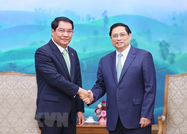 ທ່ານນາຍົກລັດຖະມົນຕີ ຟ້າມມິງຈິງ ຕ້ອນຮັບ ເຈົ້າຄອງນະຄອນຫລວງ ວຽງຈັນ, ທ່ານ ອາດສະພັງທອງ ສີພັນດອນ . ພາບ: Dương Giang/TTXVN |