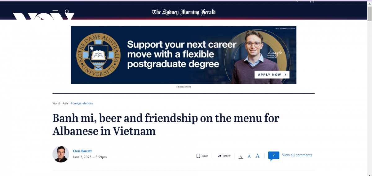 ໃນສອງມື້ຜ່ານມາ, ສື່ມວນຊົນຂອງ ອົດສະຕາລີ ໄດ້ໃຫ້ຂ່າວ, ບົດຢ່າງຫຼວງຫຼາຍກ່ຽວກັບການຢ້ຽມຢາມ ຫວຽດນາມ ເປັນເວລາສອງວັນ (3 – 4 ມິຖຸນາ) ຂອງທ່ານນາຍົກລັດຖະມົນຕີ Anthony Albanese. ນອກຈາກການເຕື້ອງເຖິງບັນດາການເຄື່ອນໄຫວຂອງທ່ານນາຍົກລັດຖະມົນຕີ Anthony Albanese ຢູ່ ຫວຽດນາມ, ບັນດາເນື້ອໃນທີ່ທ່ານໄດ້ແລກປ່ຽນທີ່ການພົບປະຄັ້ງຕ່າງໆ, ສື່ມວນຊົນ ອົດສະຕາລີ ກໍ່ຄັດສະເໜີບັນດາຂໍ້ສັງເກດອັນຕັ້ງໜ້າຂອງທ່ານນາຍົກລັດຖະມົນຕີ Anthony Albanese ກ່ຽວກັບການພົວພັນກັບ ຫວຽດນາມ.