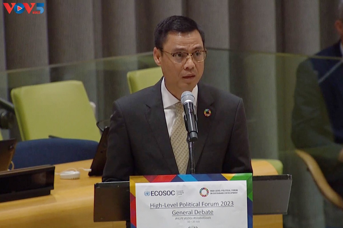 ວັນທີ 19 ກໍລະກົດ, ຢູ່ນິວຢອກ, ອາເມລິກາ, ທ່ານເອກອັກຄະລັດຖະທູດ ດັ່ງຮ່ວາງຢາງ, ຫົວໜ້າຄະນະຜູ້ຕາງໜ້າ ຫວຽດນາມ ປະຈຳ ສປຊ ໄດ້ກ່າວຄຳເຫັນທີ່ວາລະປຶກສາຫາລືລວມເວທີປາໄສການເມືອງຂັ້ນສູງ ກ່ຽວກັບການພັດທະນາແບບຍືນຍົງຂອງສະພາເສດຖະກິດ - ສັງຄົມ ສປຊ (ECOSOC). ທ່ານເອກອັກຄະລັດຖະທູດ ດັ່ງຮ່ວາງຢາງ ຖືວ່າ ຕ້ອງຜັນຂະຫຍາຍບັນດາມາດຕະການຢ່າງແຮງ, ຮີບດ່ວນກ່ວາອີກ ດ້ວຍການເຂົ້າຮ່ວມຂອງຫຼາຍຝ່າຍທີ່ກ່ຽວຂ້ອງເພື່ອຍູ້ໄວການປະຕິບັດ ຈຶ່ງຈະສາມາດປະຕິບັດສຳເລັດບັນດາເປົ້າໝາຍພັດທະນາແບບຍືນຍົງ (SDGs) ຂອງໂຄງການດຳເນີນງານ 2030 ກ່ຽວກັບການພັດທະນາແບບຍືນຍົງ. ໃນ 7 ປີຜ່ານມາ, ຫວຽດນາມ ໄດ້ຜັນຂະຫຍາຍຫຼາຍໂຄງການກະທຳແຫ່ງຊາດເພື່ອປະຕິບັດໂຄງການດຳເນີນງານ 2030 ແລະ ບັນດາ SDGs ກັບການເຂົ້າຮ່ວມຂອງທຸກພາກສ່ວນ ດ້ວຍຫຼັກການ “ບໍ່ປະໃຫ້ຜູ້ໃດຖືກຕົກຢູ່ທາງຫຼັງ”.