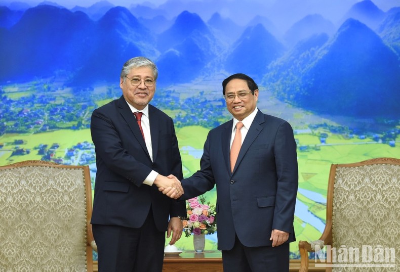 ທ່ານນາຍົກລັດຖະມົນຕີ ຟ້າມມິງຈິງ ໃຫ້ການຕ້ອນຮັບທ່ານລັດຖະມົນຕີການຕ່າງປະເທດ ຟີລິບປິນ Enrique A. Manalo (ພາບ: nhandan.vn) |