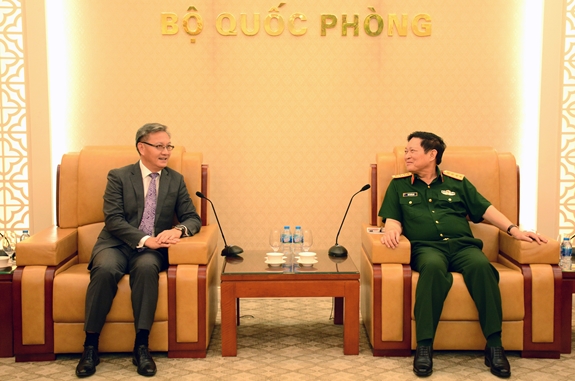 ທ່ານພົນເອກ ໂງຊວັນລິກ, ລັດຖະມົນຕີກະຊວງປ້ອງກັນປະເທດຫວຽດນາມ ຕ້ອນຮັບທ່ານ ທອງສະຫວັນ ພົມວິຫານ ເອກອັກຄະລັດຖະທູດຜູ້ມີອໍານາດເຕັມແຫ່ງ ສປປ.ລາວ ປະຈໍາຫວຽດນາມ (ພາບ: www.qdnd.vn) |