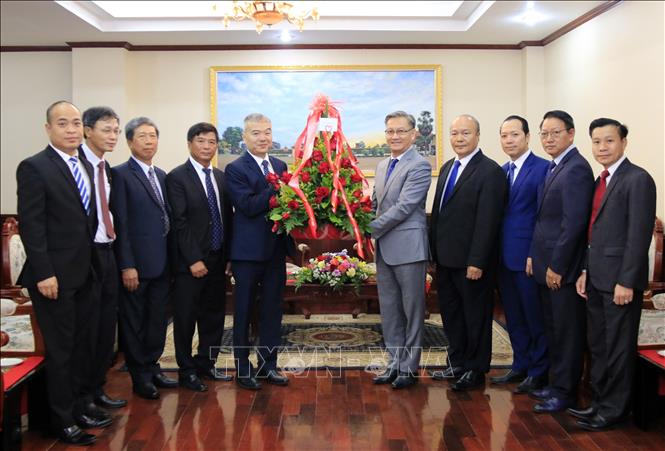 ທ່ານ ຫງວຽນແທັງຕຸ່ງ ອຸປະທູດຫວຽດນາມ ປະຈໍາ ລາວ ອວຍພອນວັນຊາດ ທ່ານ ທອງສະຫວັນ ພົມວິຫານ ຮອງລັດຖະມົນຕີກະຊວງການຕ່າງປະເທດ ລາວ (ພາບ: TTXVN) |
