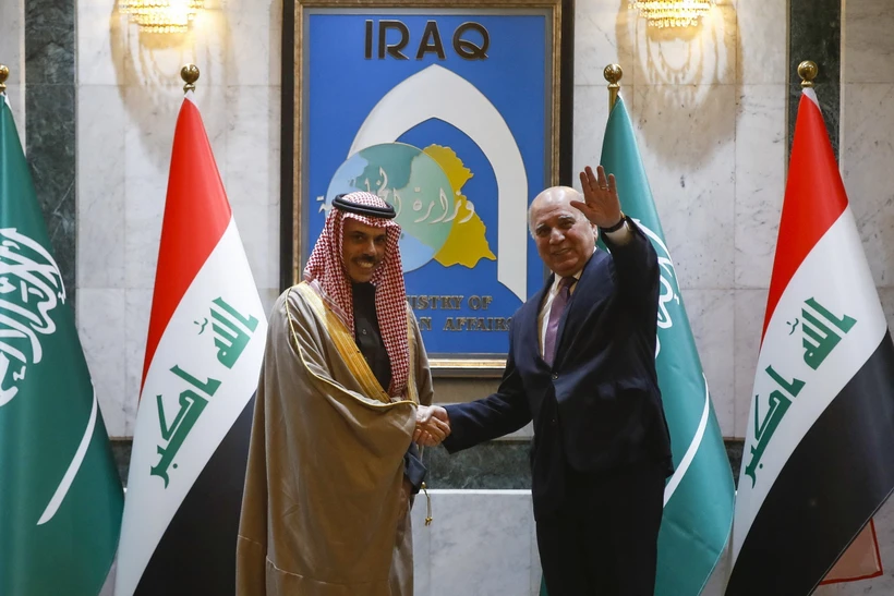 ທ່ານລັດຖະມົນຕີການຕ່າງປະເທດ ອີຣັກ Fuad Hussein ແລະ ຄູ່ຮ່ວມຕຳແໜ່ງ ອາຣັບບິ ຊາອຸດິ ທ່ານ Faisal bin Farhan Al-Saud (ພາບ: AFP/ TTXVN) |