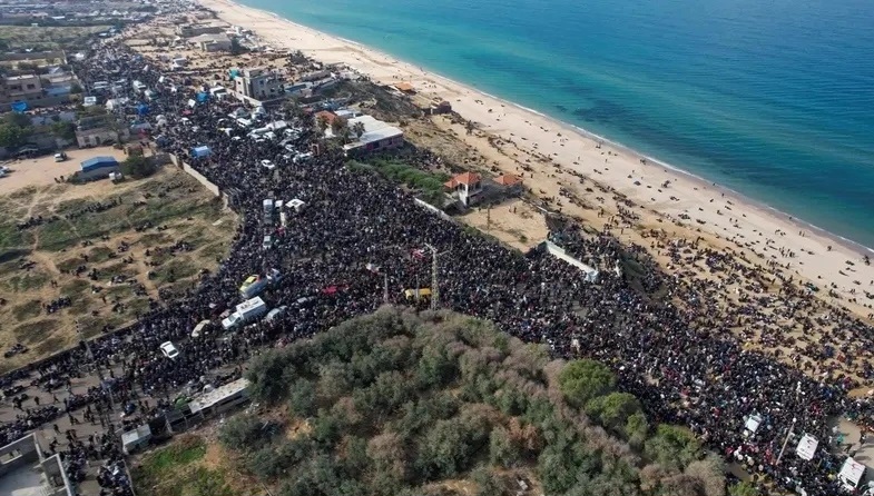 ປະຊາຊົນ ຢູ່ ເຂດ ກາຊາ ເຕົ້າໂຮມກັນຢູ່ ໃຈກາງເຂດດິນແດນນີ້ ເພື່ອລໍຖ້າໄດ້ກັບຄືນເມືອບ້ານຢູ່ທາງທິດເຫນືອ. (ພາບ:Reuters) |