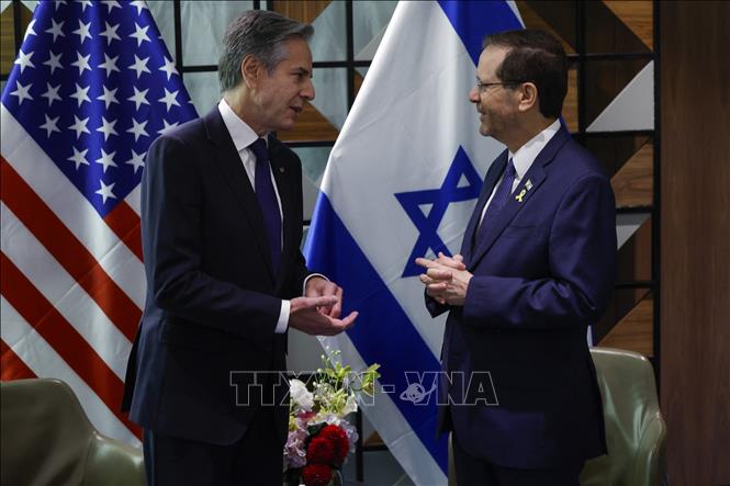 ທ່ານລັດຖະມົນຕີການຕ່າງປະເທດ ອາເມລິກາ Antony Blinken ເຂົ້າຢ້ຽມຂ່ຳນັບທ່ານປະທານາທິບໍດີ ອິດສະຣາແອັນ Isaac Herzog (ພາບ: AFP/TTXVN) |