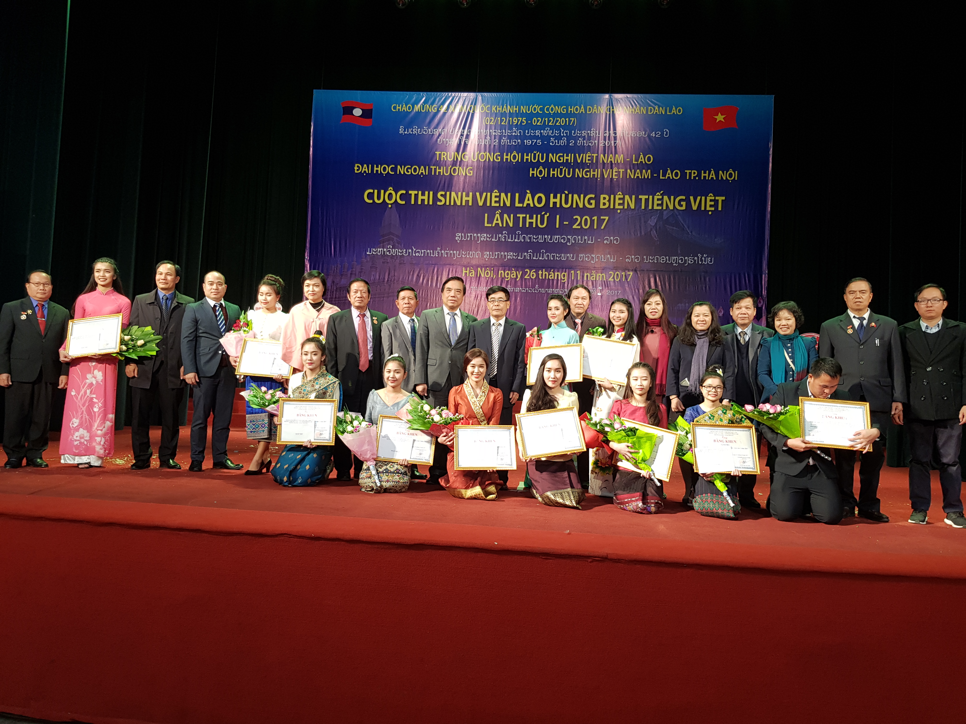 ເນື່ອງໃນໂອກາດສະເຫຼີມສະຫຼອງ 42 ປີແຫ່ງວັນສະຖາປະນາປະເທດ ສປປ ລາວ (2/12/1975 – 2/12/2017), ວັນທີ 26 ພະຈິກ, ຢູ່ຮ່າໂນ້ຍ, ສູນກາງສະມາຄົມມິດຕະພາບ ຫວຽດນາມ - ລາວ, ສະມາຄົມມິດຕະພາບ ຫວຽດນາມ - ລາວ ນະຄອນ ຮ່າໂນ້ຍ ສົມທົບກັບມະຫາວິທະຍາໄລການຄ້າຕ່າງປະເທດ ຈັດຕັ້ງການແຂ່ງຂັນນັກສຶກສາ ລາວ ປາຖະກະຖາພາສາ ຫວຽດຄັ້ງທີ 1 ປີ 2017.