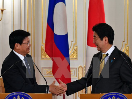 ທ່ານນາຍົກລັດຖະມົນຕີ ຍີ່ປຸ່ນ Shinzo Abe ແລະ ທ່ານນາຍົກລັດຖະມົນຕີ ລາວ ທອງລຸນ ສີສຸລິດ (ພາບ: AFP) |