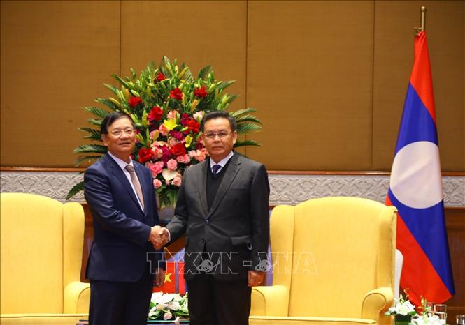 ທ່ານປະທານສະພາແຫ່ງຊາດ ລາວ ໄຊສົມພອນ ພົມວິຫານ ແລະ ທ່ານ ເຈິ່ນວັນຕຸ້ຍ, ຫົວໜ້າສະມາຄົມມິດຕະພາບ ຫວຽດນາມ - ລາວ (ພາບ: TTXVN) |