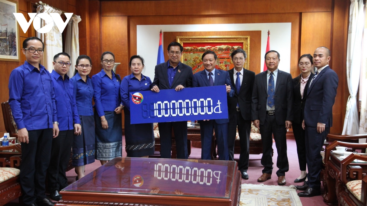 ທ່ານເລຂາຜູ້ທີ 1 ຄະນະບໍລິຫານງານສູນກາງຊາວໜຸ່ມປະຊາຊົນປະຕິວັດ ລາວ ອາລຸນໄຊ ສູນນະລາດ ໄດ້ມອບເງິນຈຳນວນ 40 ລ້ານກີບ (ປະມານ 100 ລ້ານດົ່ງ) ໃຫ້ແກ່ສະຖານທູດຫວຽດນາມ ປະຈຳ ສປປ ລາວ |