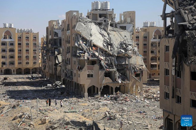 ຕຶກອາຄານຢູ່ ເຂດ ກາຊາ ຖືກພັງທະລາຍຍ້ອນການບຸກໂຈມຕີທາງອາກາດຂອງ ອິດສະຣາແອັນ (ພາບ: ສຳນັກຂ່າວສານ ຊິນຮວາ) |
