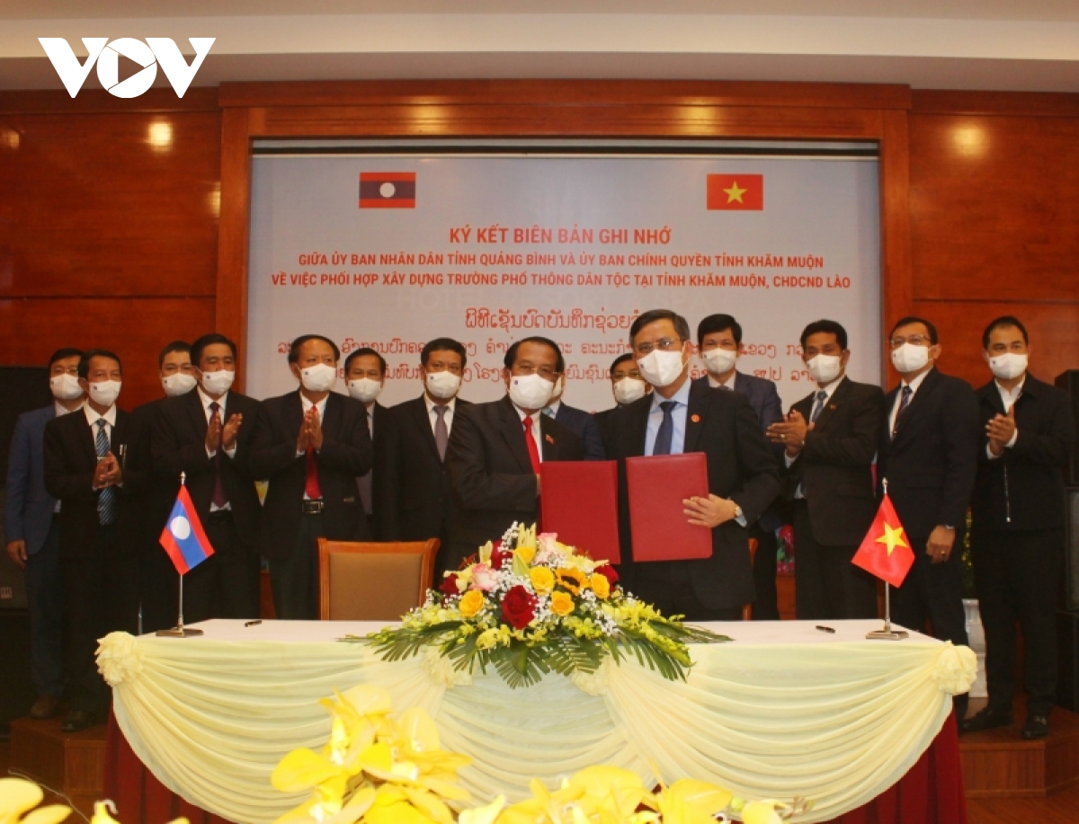 ເນື່ອງໃນໂອກາດນີ້, ທ່ານ ເຈີນທັງ, ປະທານຄະນະປະກຳມະການຊາຊົນແຂວງ ກວາງບິງ ແລະ ທ່ານ ວັນໄຊ ພົງສະຫວັນ, ເລຂາພັກແຂວງ, ເຈົ້າແຂວງໆ ຄຳມ່ວນ, ໄດ້ລົງນາມບົດບັນທຶກຊ່ວຍຈຳກ່ຽວກັບການສົມທົບກັນກໍ່ສ້າງໂຮງຮຽນສາມັນກິນນອນຊົນເຜົ່າຢູ່ແຂວງ ຄຳມ່ວນ. ນີ້ແມ່ນ 1 ໃນ 7 ໂຄງການຂອງລັດຖະບານ ຫວຽດນາມ ໜູນຊ່ວຍ ລັດຖະບານ ລາວ. ໂຄງການນີ້ແມ່ນ 1 ໃນບັນດາໂຄງການຫຼັກແຫຼ່ງ, ສະແດງໃຫ້ເຫັນສາຍພົວພັນພິເສດ ຫວຽດນາມ - ລາວ.