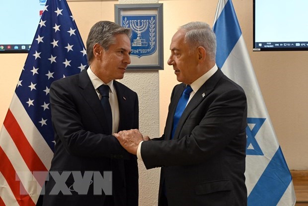 ທ່ານນາຍົກລັດຖະມົນຕີ ອິດສະຣາແອັນ Benjamin Netanyahu (ເບື້ອງຂວາ) ໃນການພົບປະກັບທ່ານລັດຖະມົນຕີການຕ່າງປະເທດ ອາເມລິກາ Antony Blinken ພົບກັນຢູ່ Tel Aviv, ວັນທີ 12/10/2023 (ພາບ: THX/TTXVN) |