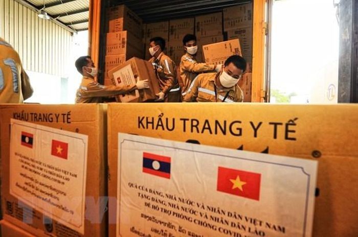 ຜ້າອັດປາກອັດດັງຂອງ ສູນກາງ ສະມາຄົມມິດຕະພາບ ຫວຽດນາມ - ລາວ ມອບໃຫ້ປະຊາຊົນ ລາວ ກຳລັງໄດ້ຂົນສົ່ງໄປ ລາວ (ພາບ: TTXVN) |