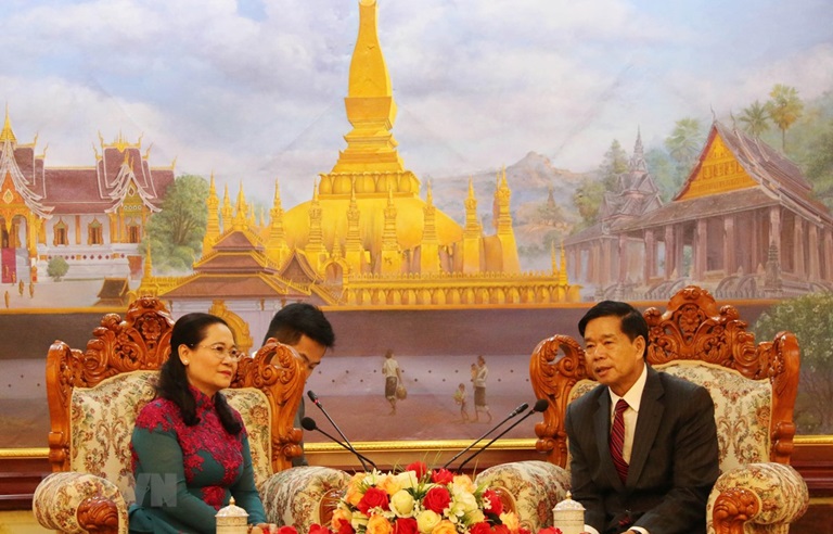 ທ່ານນາງ ຫງວຽນທິເລະ ຮອງເລຂາ ຄະນະພັກນະຄອນ, ປະທານສະພາປະຊາຊົນນະຄອນ ໂຮ່ຈີມິນ ແລະ ທ່ານ ສິນລະວົງ ຄຸດໄພທູນ ກຳມະການກົມການເມືອງ, ເຈົ້າຄອງ ນະຄອນຫຼວງວຽງຈັນ (ພາບ: TTXVN) |