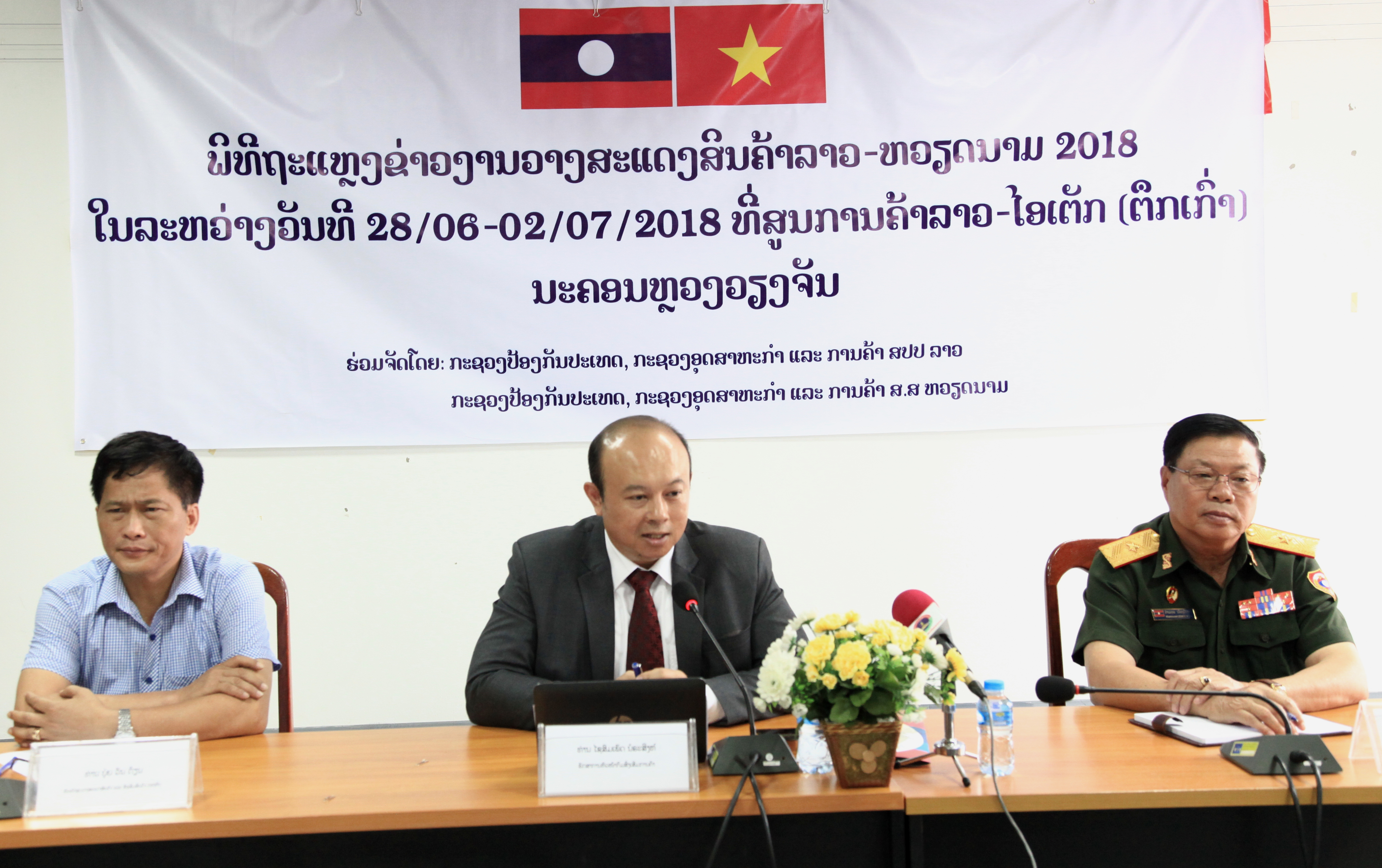 ຕອນບ່າຍວັນທີ 25 ມິຖຸນາ, ຢູ່ນະຄອນຫຼວງວຽງຈັນ, ປະເທດລາວ. ກະຊວງປ້ອງກັນປະເທດຫວຽດນາມສົມທົບກັບກະຊວງອຸດສາຫະກຳ - ການຄ້າ ຫວຽດນາມ, ກະຊວງອຸດສາຫະກຳ - ການຄ້າ ແລະ ກະຊວງປ້ອງກັນປະເທດລາວ ຈັດຕັ້ງການປະຊຸມຂ່າວ ເພື່ອແຈ້ງໃຫ້ຊາບກ່ຽວກັບງານຕະຫຼາດນັດການຄ້າຫວຽດນາມ - ລາວ ປີ 2018.