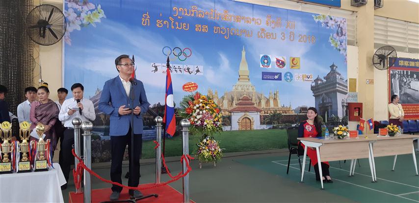 ເຂົ້າຮ່ວມງານກິລານັກສຶກສາ ລາວ ຢູ່ ຫວຽດນາມ ຄັ້ງນີ້ ມີທ່ານເອກອັກຄະລັດຖະທູດ ລາວ ປະຈຳ ຫວຽດນາມ ທອງສະຫວັນ ພົມວິຫານ, ຜູ້ຕາງໜ້າເລຂາຄະນະຊາວໜຸ່ມນະຄອນ ຮ່າໂນ້ຍ, ສະຫະສະມາຄົມບັນດາອົງການມິດຕະພາບ ຫວຽດນາມ - ລາວ ຢູ່ນະຄອນຫລວງ ຮ່າໂນ້ຍ, ຄູອາຈານມະຫາວິທະຍາໄລອຸດສາຫະກຳ ຮ່າໂນ້ຍ ພ້ອມກັບນັກສຶກສາລາວພວມຮ່ຳຮຽນຢູ່ບັນດາມະຫາວິທະຍາໄລ, ວິທະຍາໄລພາກເໜືອ ຫວຽດນາມ ເປັນຈຳນວນຫລວງຫລາຍ. ງານກິລາປີ 2018 ປີ 49 ໂຮງຮຽນເຂົ້າຮ່ວມ. ກ່າວຄຳເຫັນທີ່ພິທີໄຂ, ທ່ານເອກອັກຄະລັດຖະທູດ ລາວ ປະຈຳ ຫວຽດນາມ ທອງສະຫວັນ ພົມວິຫານ ໃຫ້ຮູ້ວ່າ: