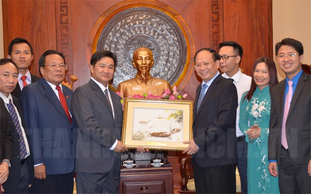 ທ່ານເຕີດແທ່ງກາງ ຮອງເລຂາຜູ້ປະຈຳຄະນະພັກນະຄອນ ໂຮ່ຈິມີນ ມອບເຄື່ອງທີ່ນະລຶກໃຫ້ຄະນະຊາວຫນຸ່ມລາວ |