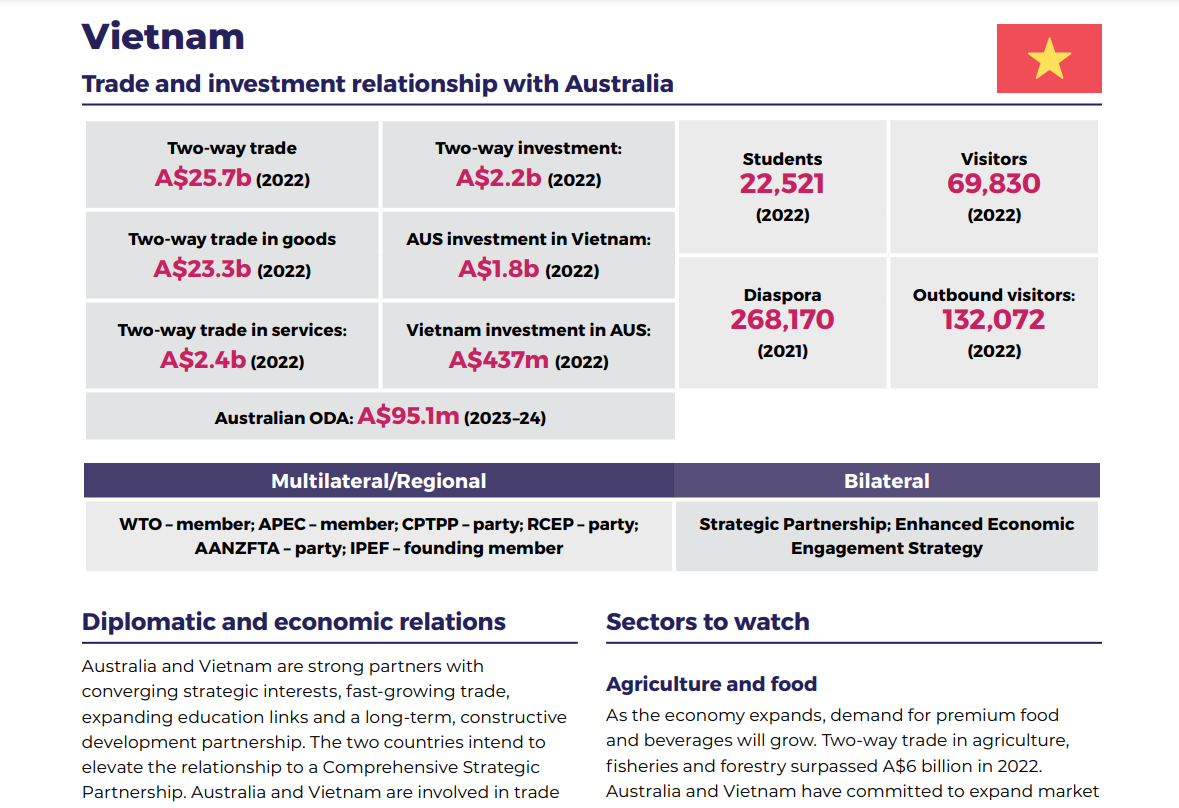 ເພື່ອເຮັດໃຫ້ການພົວພັນກັບເຂດອາຊີຕາເວັນອອກສ່ຽງໃຕ້ເລິກເຊິ່ງກ່ວາອີກ, ວັນທີ 28 ກັນຍາ ອົດສະຕາລີ ຫາກໍ່ປະກາດຍຸດທະສາດເສດຖະກິດອາຊີຕາເວັນອອກສ່ຽງໃຕ້ ຮອດປີ 2040. ໃນຍຸດທະສາດນີ້, ອົດສະຕາລີຢັ້ງຢືນວ່າ ຫວຽດນາມ ແລະ ອົດສະຕາລີ ມີການພົວພັນຄູ່ຮ່ວມມືຢ່າງແໜ້ນແຟ້ນເມື່ອມີຜົນປະໂຫຍດຍຸດທະສາດລວມ, ການພົວພັນທາງການຄ້າມີການເຕີບໂຕໂດຍໄວ ແລະ ການເຊື່ອມຕໍ່ໃນຂົງເຂດການສຶກສາໄດ້ຮັບການເປີດກວ້າງ. ດັ່ງນັ້ນ, ອົດສະຕາລີຢັ້ງຢືນຈະຊຸກຍູ້ການພົວພັນກັບ ຫວຽດນາມ ໃນ4 ຂົງເຂດລວມມີ: ກະສິກຳ ແລະ ອາຫານການກິນ, ຊັບພະຍາກອນທຳມະຊາດ, ການຫັນເປັນສີຂຽວ ແລະ ການສຶກສາ - ບຳລຸງສ້າງວິຊາຊີບ.