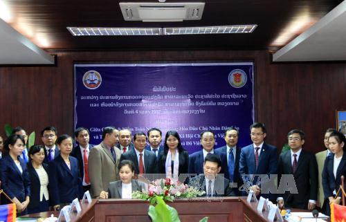 (vovworld) – ໃນຂອບເຂດການຢ້ຽມຢາມ ແລະ ເຮັດວຽກຢູ່ລາວແຕ່ວັນທີ 3 -5/4, ຕອນບ່າຍວັນທີ 4/4, ຢູ່ນະຄອນຫຼວງວຽງຈັນ, ທ່ານ ໂຮ່ດືກເຟີກ, ຫົວໜ້າອົງການກວດສອບແຫ່ງລັດຫວຽດນາມ ໄດ້ເຈລະຈາກັບທ່ານ ວຽງທອງ ສີພັນດອນ, ອົງການກວດສອບແຫ່ງລັດລາວ.