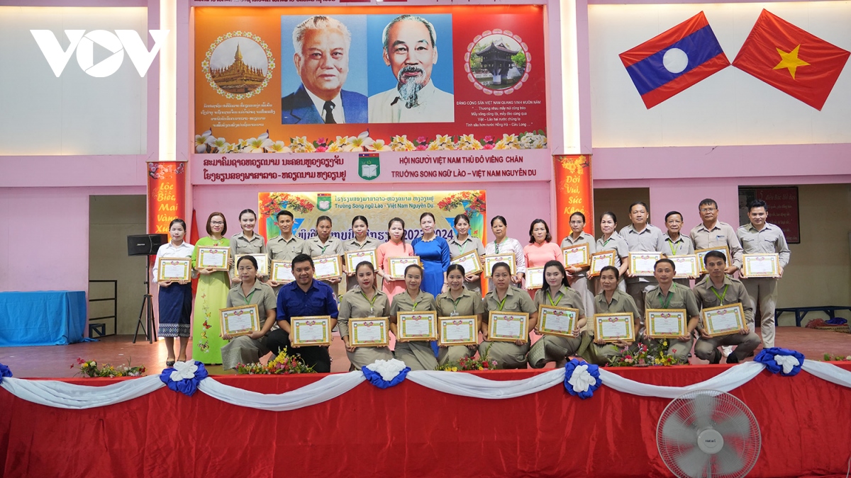 ວັນທີ 24 ມິຖຸນາ, ຢູ່ນະຄອນຫຼວງ ວຽງຈັນ, ໂຮງຮຽນ 2 ພາສາ ລາວ - ຫວຽດນາມ ຫງວຽນຢູ ໄດ້ຈັດພິທີສະຫຼຸບປິດສົກຮຽນ 2023 – 2024. ໃນສົກຮຽນຜ່ານມາ, ໂຮງຮຽນ 2 ພາສາ ລາວ - ຫວຽດນາມ ຫງວຽນຢູ ບັນລຸຜົນງານຕັ້ງໜ້າຫຼາຍຢ່າງ, ມີນັກຮຽນ 20 ຄົນບັນລຸຜົນງານນັກຮຽນເກັ່ງຂັ້ນເມືອງ. ພ້ອມກັນນັ້ນ, ໂຮງຮຽນກໍ່ຈັດບັນດາການແຂ່ງຂັນສະແດງສິລະປະ, ກິລາ ແລະ ການເຄື່ອນໄຫວອື່ນໆໃຫ້ແກ່ນັກຮຽນ, ຄູອາຈານ… ບັນລຸຜົນສຳເລັດ. ໃນນັ້ນ, ສິ່ງທີ່ໜ້າສົນໃຈແມ່ນ, ການແຂ່ງຂັນແຕ້ມພາບ “ນ້ອງແຕ້ມປະທານ ໂຮ່ຈີມິນ” ເນື່ອງໃນໂອກາດສະເຫຼີມສະຫຼອງ 134 ປີແຫ່ງວັນຄ້າຍວັນເກີດຂອງປະທານ ໂຮ່ຈີມິນ (19 ພຶດສະພາ 1890 – 19 ພຶດສະພາ 2024).