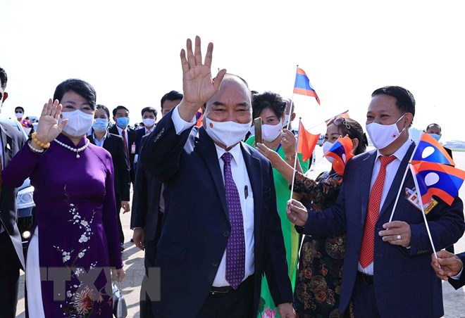 ທ່ານປະທານປະເທດ ຫວຽດນາມ ຫງວຽນຊວັນຟຸກ ພ້ອມກັບພັນລະຍາ ເດີນທາງມາຮອດສະໜາມບິນສາກົນ ວັດໄຕ (ພາບ: vov.vn) |