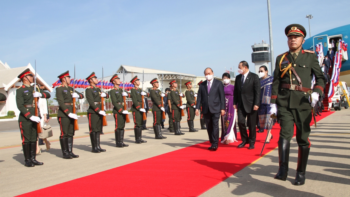 ທີ່ການຕ້ອນຮັບ ທ່ານປະທານປະເທດ ຫວຽດນາມ ຫງວຽນຊວັນຟຸກ ພ້ອມກັບພັນລະຍາ ຢູ່ສະໜາມບິນ, ຝ່າຍລາວມີ ທ່ານ ສອນໄຊ ສີພັນດອນ, ຮອງນາຍົກລັດຖະມົນຕີ, ລັດຖະມົນຕີກະຊວງແຜນການ ແລະ ການລົງທຶນ ພ້ອມພັນລະຍາ, ທ່ານນາງ ເຂັມມະນີ ພົນເສນາ ລັດຖະມົນຕີ, ຫົວໜ້າຫ້ອງວ່າການປະທານປະເທດ, ທ່ານ ໂພໄຊ ໄຂຄຳພິທູນ, ຮອງລັດຖະມົນຕີກະຊວງການຕ່າງປະເທດ ແລະ ພະນັກງານອີກຈຳນວນໜຶ່ງ. ສ່ວນຝ່າຍ ຫວຽດນາມ ມີ ທ່ານເອກອັກຄະລັດຖະທູດ ຫວຽດນາມ ປະຈຳ ລາວ ຫງວຽນບ໊າຮຸ່ງ ແລະ ພັນລະຍາ, ພະນັກງານສະຖານທູດ ແລະ ພໍ່ແມ່ປະຊາຊົນຊາວຫວຽດນາມ ອາໄສຢູ່ ລາວ ຈຳນວນໜຶ່ງ.