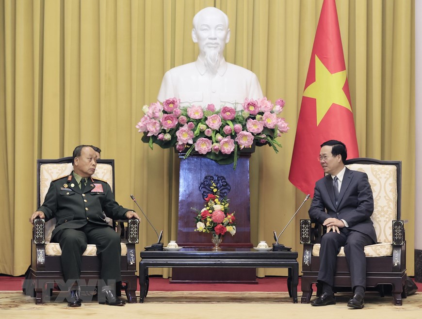 ທ່ານປະທານປະເທດ ຫວຽດນາມ ຫວໍວັນເຖືອງ ຕ້ອນຮັບທ່ານພົນໂທ ທອງລອຍ ສີລິວົງ, ຮອງລັດຖະມົນຕີກະຊວງປ້ອງກັນປະເທດ, ຫົວໜ້າກົມໃຫຍ່ການເມືອງກອງທັບປະຊາຊົນ ລາວ (ພາບ: TTXVN) |