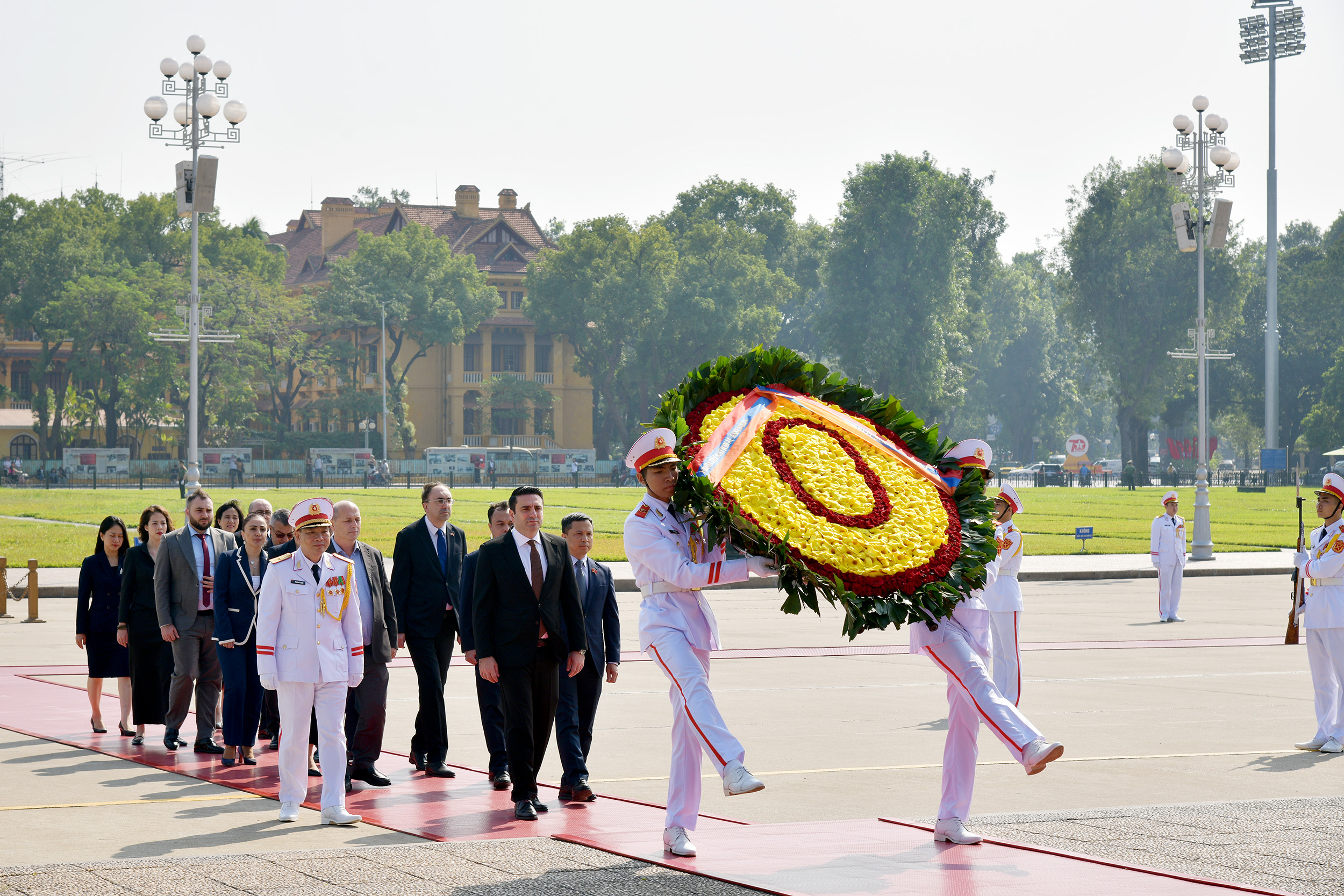 ທ່ານປະທານສະພາແຫ່ງຊາດ ສ. ອາກເມເນຍ Alen Simonyan ແລະ ຄະນະຜູ້ແທນ ເຂົ້າຄຳນັບສຸສານປະທານ ໂຮ່ຈີມິນ (ພາບ: quochoi.vn) |