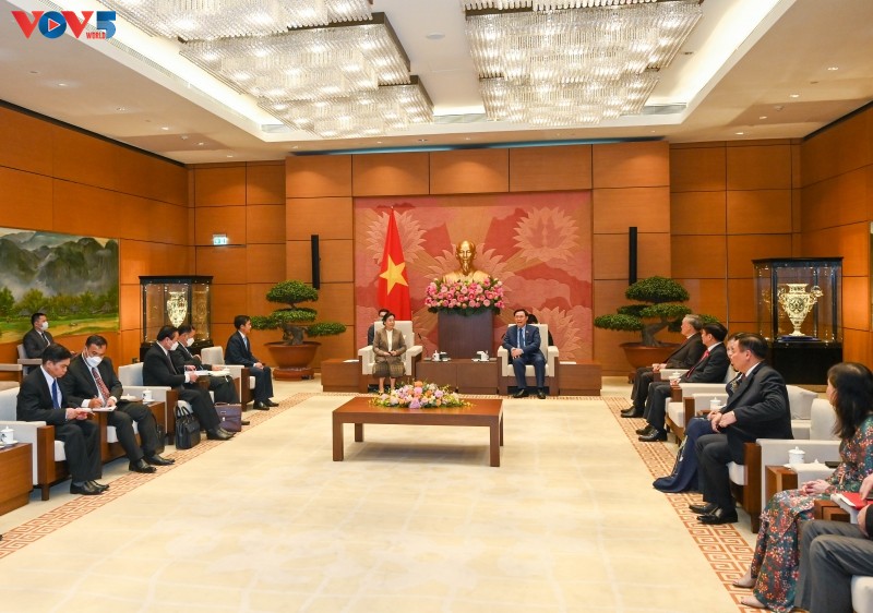 ທ່ານປະທານສະພາແຫ່ງຊາດ ຫວຽດນາມ ເວືອງດິ່ງເຫວ້ ຕ້ອນຮັບທ່ານນາງ ສາດສະດາຈານ. ປອ.ວຽງທອງ ສີພັນດອນ, ປະທານສານປະຊາຊົນສູງສຸດ ລາວ (ພາບ: VOV) |