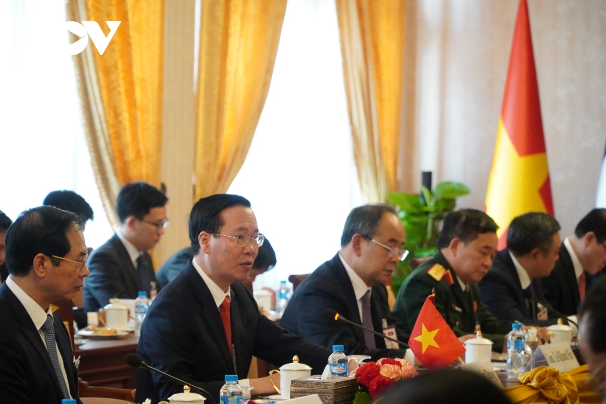 ທ່ານປະທານປະເທດ ຫວຽດນາມ ຫວໍວັນເຖືອງ ພ້ອມກັບຄະນະຜູ້ແທນ ຫວຽດນາມ ທີ່ງານພົບປະສົນທະນາ |