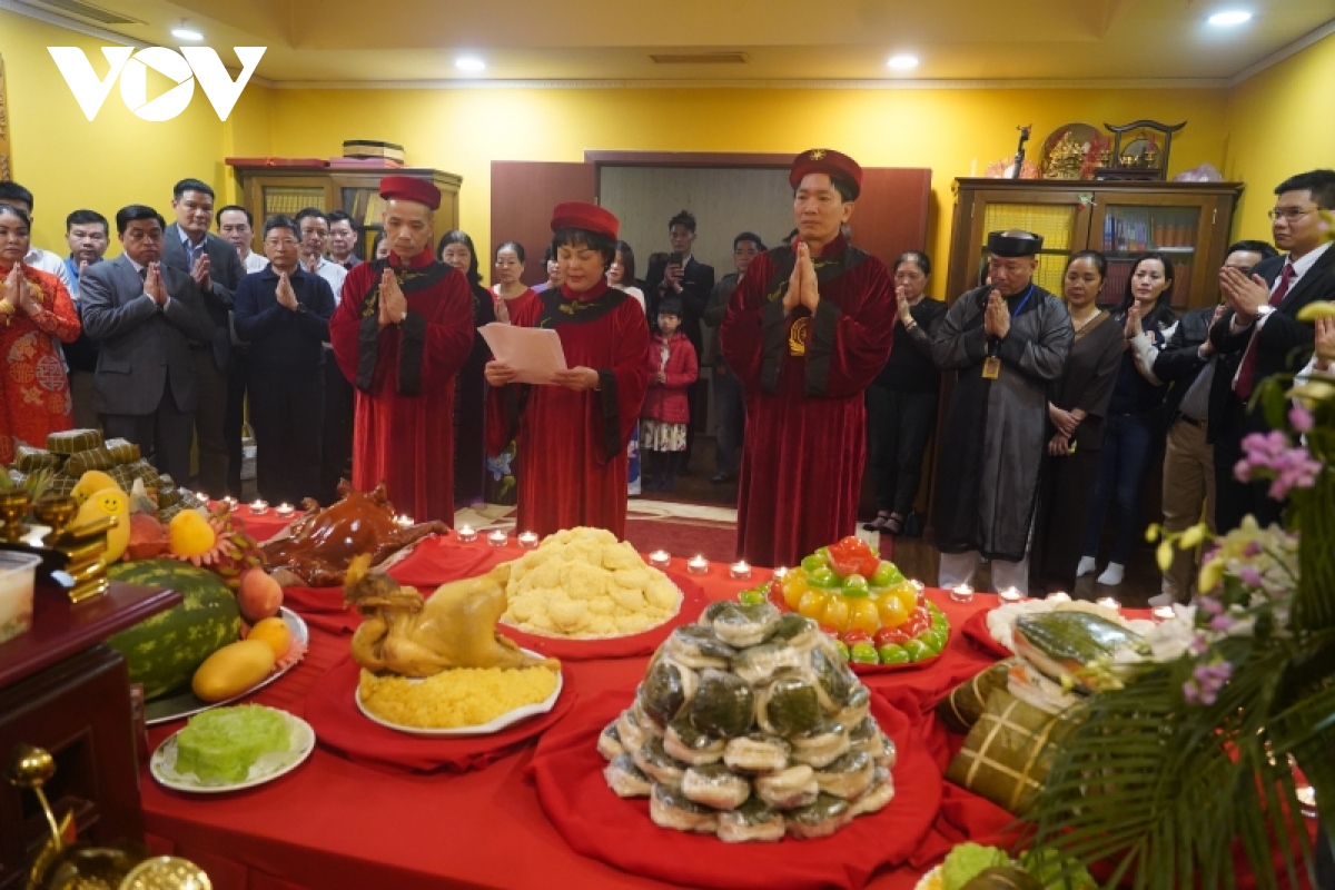 ເຂົ້າຮ່ວມພິທີ ມີປະຊາຄົມຊາວຫວຽດນາມ ເປັນຈຳນວນຫຼາຍ ພວມດຳລົງຊີວິດ ແລະ ເຮັດວຽກຢູ່ລາວ ແລະ ຜູ້ຕາງໜ້າປະຊາຊົນທີ່ມາຈາກຫຼາຍປະເທດພວມອາໄສຢູ່ລາວ… ໃນບັນຍາກາດສັກກະລະບູຊານັ້ນ, ທ່ານເອກອັກຄະລັດຖະທູດ ຫວຽດນາມ ປະຈຳ ລາວ ຫງວຽນບ໊າຮຸ່ງ ພ້ອມກັບຜູ້ຕາງໜ້າບັນດາອົງການປະຊາຄົມທັງຢູ່ພາຍໃນ ແລະ ຕ່າງປະເທດ ໄດ້ຖະຫວາຍທູບທຽນ, ດອກໄມ້ ສະແດງຄວາມເຄົາລົບນັບຖື ແລະ ຄວາມຮູ້ບຸນຄຸນຕໍ່ຄຸນງາມຄວາມດີຂອງເຈົ້າຊີວິດຮຸ່ງ 18 ອົງ ແລະ ບັນພະບຸລຸດ.
