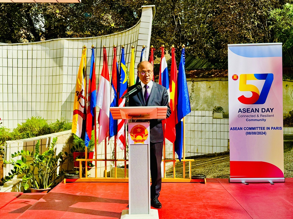 ເນື່ອງໃນໂອກາດສະເຫຼີມສະຫຼອງ 57 ປີແຫ່ງວັນສ້າງຕັ້ງອາຊຽນ (08/08/1967 – 08/08/2023), ວັນທີ 8 ສິງຫາ, ທີ່ສຳນັກງານຢູ່ນະຄອນຫຼວງ ປາຣີ, ສະຖານທູດ ຫວຽດນາມ ປະຈຳ ຝລັ່ງ ໄດ້ຈັດພິທີເອົາທຸງ ອາຊຽນ ຂຶ້ນເສົາ ດ້ວຍການເຂົ້າຮ່ວມຂອງເອກອັກຄະລັດຖະທູດບັນດາປະເທດສະມາຊິກ, ພະນັກງານສະຖານທູດ, ກໍ່ຄືຜູ້ຕາງໜ້າ ກະຊວງເອີລົບ ແລະ ການຕ່າງປະເທດ ຝລັ່ງ, ພ້ອມກັບນັກກິລາບັນດາປະເທດ ອາຊຽນ ທີ່ເຂົ້າຮ່ວມ Olympic Paris 2024.