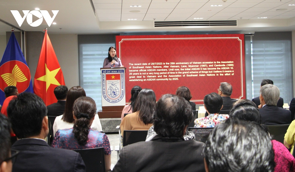 ວັນທີ 11 ສິງຫາ, ຢູ່ນະຄອນ ໂຮ່ຈີມິນ, ສະຫະພັນບັນດາອົງການຈັດຕັ້ງມິດຕະພາຍນະຄອນ, ສະມາຄົມມິດຕະພາບຫວຽດນາມ-ອາຊີຕາເວັນອອກສ່ຽງໃຕ້ ສົມທົບກັບມະຫາວິທະຍາໄລເປີດ ນະຄອນ ໂຮ່ຈີມິນ ໄດ້ຈັດພິທີ ສະເຫຼີມສະຫຼອງ 28 ປີແຫ່ງວັນ ຫວຽດນາມ ເຂົ້າເປັນສະມາຊິກ ອາຊຽນ (28/7/1995 - 28/7/2023) ແລະ 56 ປີແຫ່ງວັນສ້າງຕັ້ງ ອາຊຽນ (8/8/1967 - 8/8/2023).