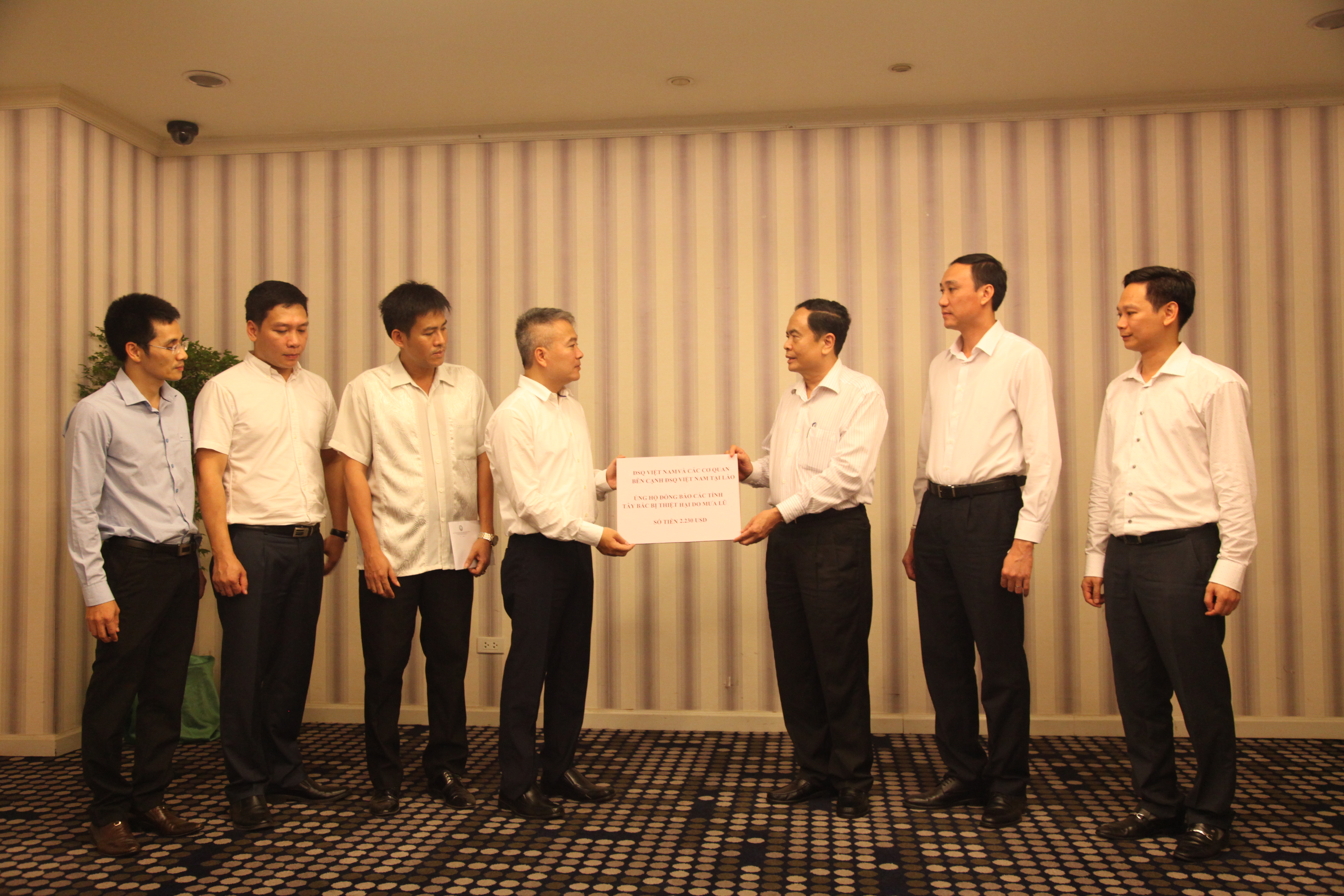 ໃຫ້ທ່ານ ເຈີ່ນແທງເມີນ ປະທານຄະນະກຳມະການສູນກາງແນວໂຮມປະເທດຊາດ ຫວຽດນາມ ເພື່ອ ສະໜັບສະໜູນພໍ່ແມ່ປະຊາຊົນບັນດາແຂວງທາງທິດຕາເວັນຕົກສ່ຽງເໜືອທີ່ ຖືກເສຍຫາຍຈາກຝົນຕົກໜັກນ້ຳຖ້ວມ. ທ່ານອັກຄະລັດຖະທູດ ຫງວຽນແທງຕູງ ໃຫ້ຮູ້ວ່າ: ນີ້ແມ່ນຈຳນວນເງິນໂດຍພະນັກງານ, ພາລະກອນສະຖານທູດ ແລະ ບັນດາອົງການຈັດຕັ້ງ ຫວຽດນາມ ປະຈຳ ລາວ ບໍລິຈາກຢ່າງໜ້ອຍສຸດແມ່ນຜູ້ລະບໍລິຈາກເງິນເດືອນ 1 ວັນ ເພື່ອສະໜັບສະໜູນພໍ່ແມ່ປະຊາຊົນບັນດາແຂວງເຂດຕາເວັນຕົກສ່ຽງເໜືອ ທີ່ຖືກເສຍຫາຍຍ້ອນຝົນຕົກໜັກນ້ຳຖ້ວມຜ່ານມາ. ເຖິງວ່າຈຳນວນເງິນບໍ່ຫລາຍກໍ່ຕາມ ແຕ່ສະແດງໃຫ້ເຫັນນ້ຳໃຈຂອງຊາວ ຫວຽດນາມ ຢູ່ຫ່າງໄກກັບບ້ານເກີດເມືອງນອນ ດ້ວຍຈິດໃຈອຸ້ນຊູຊ່ວຍເຫຼືອເຊິ່ງກັນ ແລະ ກັນ, ປາດຖະໜາແບ່ງເບົາຄວາມຫຍຸ້ງຍາກເສຍຫາຍສ່ວນໃດສ່ວນໜຶ່ງ ເຊິ່ງພໍ່ແມ່ປະຊາຊົນບັນດາແຂວງທາງທິດຕາເວັນຕົກສ່ຽງເໜືອໄດ້ປະສົບໃນຊຸມວັນຜ່ານມາ.