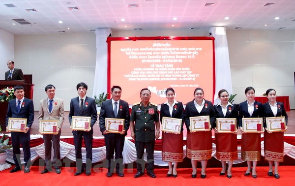 ທ່ານພົນໂທ ຈັນສະໝອນ ຈັນຍາລາດ ມອບໃບຍ້ອງຍໍໃຫ້ບັນດາບຸກຄົນ ທີ່ມີໝາກຜົນດີເດັ່ນຂອງບໍລິສັດ Star Telecom (ພາບ: ຫວຽດນາມ+) |