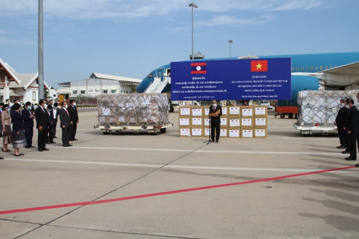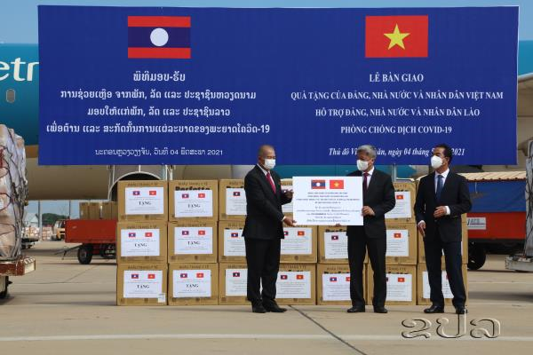 ວັນທີ 04 ພຶດສະພາ, ທີ່ສະໜາມບິນສາກົນວັດໄຕ ໄດ້ດຳເນີນພິທີມອບ-ຮັບ ການຊ່ວຍເຫຼືອຈາກພັກ, ລັດ ແລະ ປະຊາຊົນ ຫວຽດນາມ ໃຫ້ແກ່ພັກ, ລັດ ແລະ ປະຊາຊົນລາວ ເພື່ອຕ້ານ ແລະ ສະກັດກັ້ນການແຜ່ລະບາດຂອງພະຍາດໂຄວິດ-19 ຮອບໃໝ່ຢູ່ ສປປ ລາວ. ໃນຄັ້ງນີ້, ສສ ຫວຽດນາມ ໄດ້ມອບເງິນສົດຈໍານວນ 500.000 ໂດລາສະຫະລັດ, ສົ່ງທີມແພດຊ່ຽວຊານຈໍານວນ 35 ທ່ານ, ພ້ອມດ້ວຍອຸປະກອນການແພດຈໍານວນໜຶ່ງມາຊ່ວຍເຫລືອ ສປປ ລາວ ປະກອບມີ: ເຄື່ອງຊ່ວຍຫາຍໃຈຈຳນວນ 200 ເຄື່ອງ, ທາດຂ້າເຊື້ອພະຍາດ (ChloramineB) ຈຳນວນ 10.000 ກິໂລ, ໜ້າກາກອະນາໄມຈໍານວນ 2 ລ້ານແຜ່ນ ແລະ ອື່ນໆ. ໃຫ້ກຽດຕາງໜ້າກ່າວມອບໂດຍທ່ານ ໂຕແອັງຢຸງ, ຮອງລັດຖະມົນຕີກະຊວງ ການຕ່າງປະເທດແຫ່ງ ສສ ຫວຽດນາມ ແລະ ຕາງໜ້າລັດຖະບານລາວ ກ່າວຮັບໂດຍທ່ານ ກິແກ້ວ ໄຂຄໍາພິທູນ, ຮອງນາຍົກລັດຖະມົນຕີແຫ່ງ ສປປ ລາວ ພ້ອມກັບຄະນະນໍາຂອງບັນດາກະຊວງ ແລະ ພະນັກງານທີ່ກ່ຽວຂ້ອງເຂົ້າຮ່ວມຢ່າງພ້ອມພຽງ.