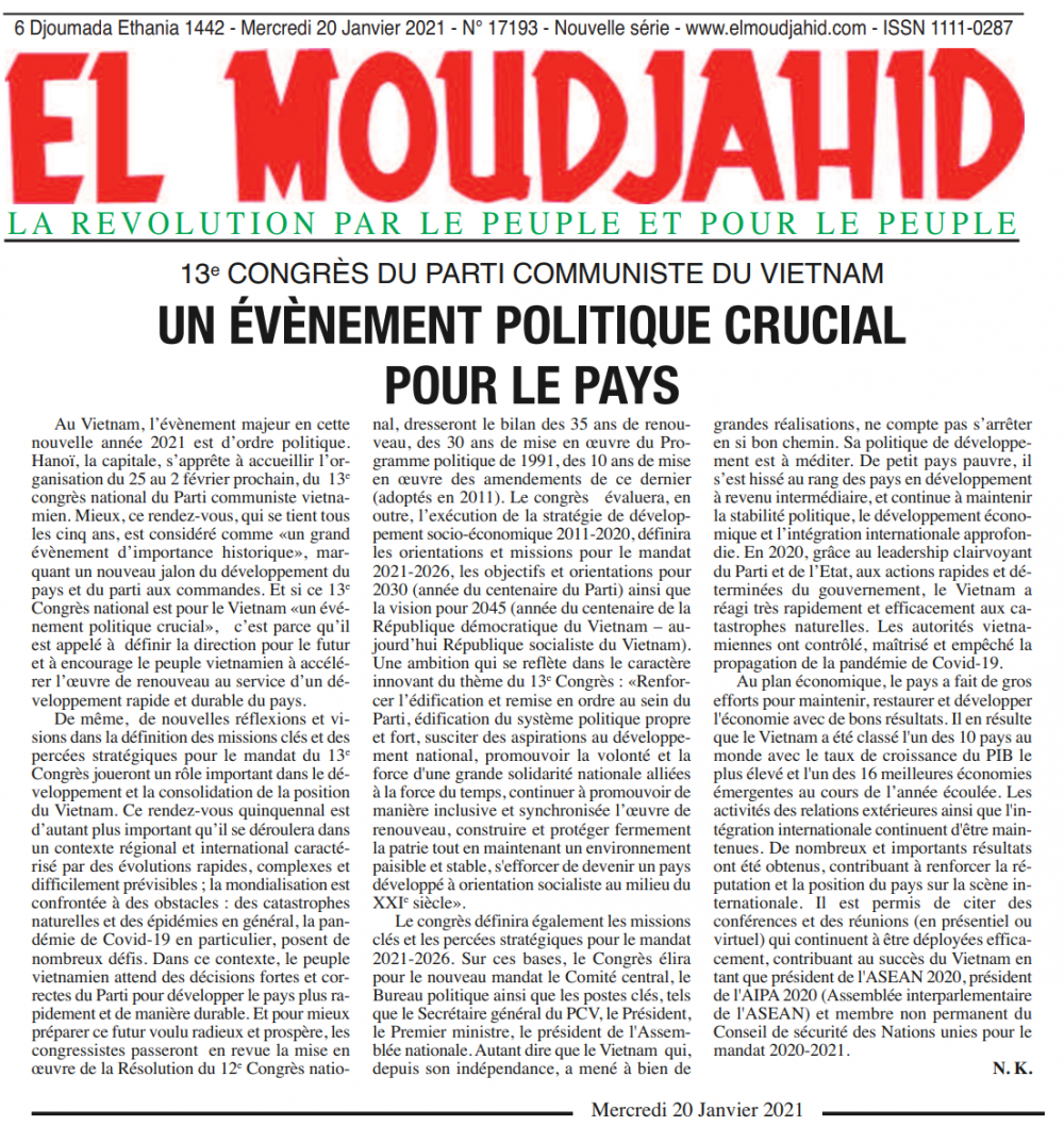 ໜັງສືພິມ El Moudjahid (ໜັງສືພິມນັກຮົບເກົ່າ, ໂດຍເປັນໜັງສືພິມທາງການໃຫຍ່ ແລະ ມີຊື່ສຽງທີ່ສຸດຢູ່ ອານເຊຣີ) ໄດ້ລົງ ບົດຂຽນ 2 ບົດ ດ້ວຍຫົວຂໍ້ຄື: “ກອງປະຊຸມໃຫຍ່ຄັ້ງທີ 13 ຂອງພັກກອມມູນິດ ຫວຽດນາມ: ເພື່ອການພັດທະນາໄລຍະໃໝ່ຂອງປະເທດຊາດ” ແລະ “ກອງປະຊຸມໃຫຍ່ຄັ້ງທີ 13 ຂອງພັກກອມມູນິດ ຫວຽດນາມ”. ທັງສອງບົດຂຽນລ້ວນແຕ່ຢັ້ງຢືນດ້ວຍຫົວຂໍ້ວ່າ “ຄວາມມຸ່ງຫວັງ, ພັດທະນາ, ປ່ຽນແປງໃໝ່, ຫົວຄິດປະດິດສ້າງ”, ນີ້ແມ່ນ “ເຫດການ ທີ່ມີຄວາມສຳຄັນຍິ່ງດ້ານປະຫວັດສາດ, ສ້າງຂີດໝາຍໃໝ່ໃນການພັດທະນາຂອງ ຫວຽດນາມ, ກໍ່ຄືຂອງພັກກອມມູນິດ ຫວຽດນາມ.