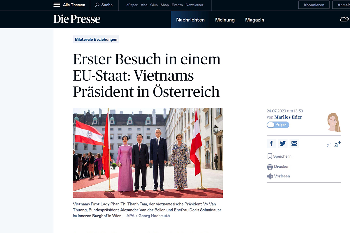ໜັງສືພິມ diepresse.com ໄດ້ລົງຂ່າວກ່ຽວກັບການຢ້ຽມຢາມ ໂອຕາລິດຢ່າງເປັນທາງການຂອງທ່ານປະທານປະເທດ ຫວໍວັນເຖືອງ (ພາບ: TTXVN) |