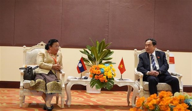 ທ່ານ ເຈິ່ນແທັງເໝີນ, ຮອງປະທານຜູ້ປະຈຳການສະພາແຫ່ງຊາດ ຫວຽດນາມ ແລະ ທ່ານນາງ ສູນທອນ ໄຊຍະຈັກ, ຮອງປະທານສະພາແຫ່ງຊາດ ແຫ່ງ ສປປ ລາວ(ພາບ: Văn Sĩ/TTXVN)