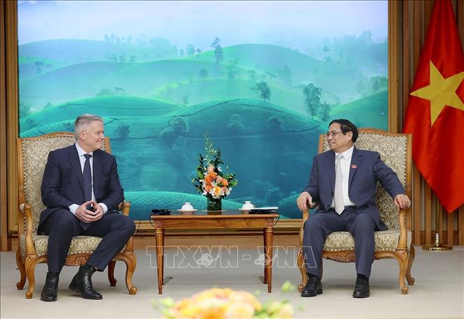 ທ່ານນາຍົກລັດຖະມົນຕີ ຟ້າມມິງຈິງ ໃຫ້ການຕ້ອນຮັບທ່ານ Mathias Cormann ເລຂານຸການໃຫຍ່ ອົງການຮ່ວມມື ແລະ ພັດທະນາ ເສດຖະກິດ (OECD) (ພາບ: TTXVN) |