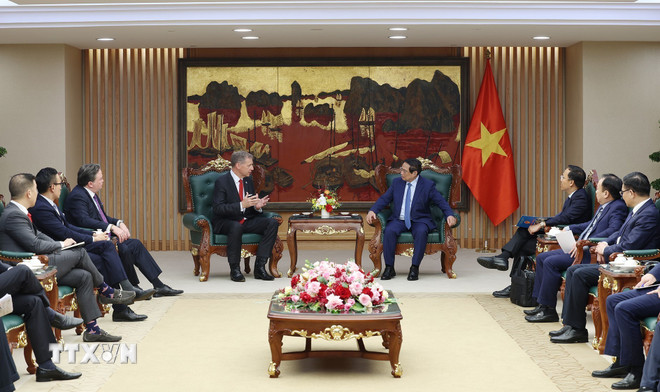 ທ່ານນາຍົກລັດຖະມົນຕີ ຟ້າມມິງຈິງ ຕ້ອນຮັບທ່ານ Steven Kobos ປະທານທັງເປັນຜູ້ອຳນວຍການຝ່າຍບໍລິຫານກຸ່ມບໍລິສັດ Excelerate Energy ແລະ ຄູ່ຮ່ວມງານ (ພາບ: TTXVN) |