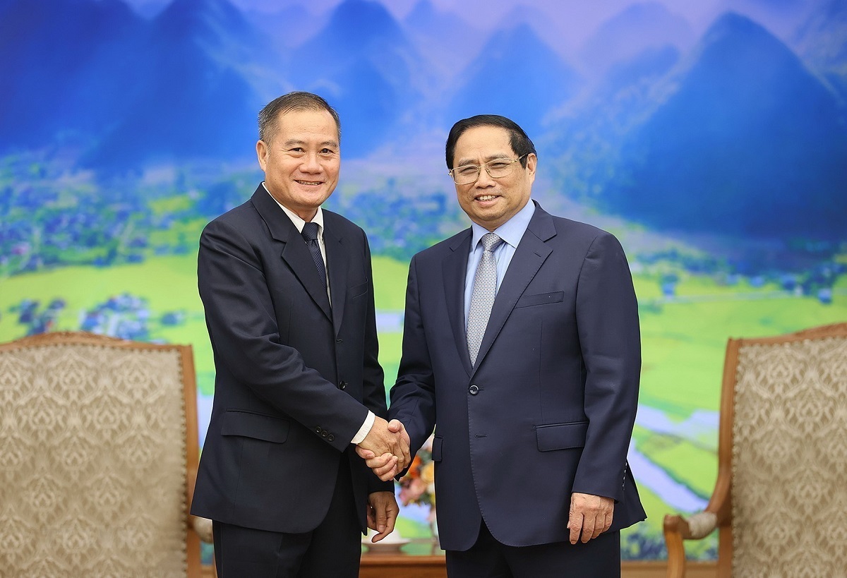 ທ່ານນາຍົກລັດຖະມົນຕີ ຟ້າມມິງຈິງ ໃຫ້ການຕ້ອນຮັບທ່ານ ຄໍາເຜີຍ ພິລາພາ ຜູ້ອຳນວຍການໃຫຍ່ ສຳນັກຂ່າວສານ ປະເທດລາວ (KPL) (ພາບ: TTXVN) |