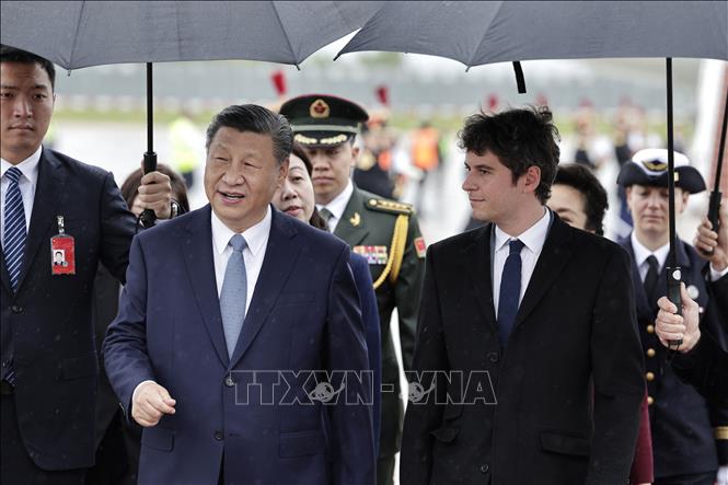 ທ່ານນາຍົກລັດຖະມົນຕີ ຝລັ່ງ Gabriel Attal (ເບື້ອງຂວາມື) ຕ້ອນຮັບທ່ານປະທານປະເທດ ຈີນ ສີຈີ້ນຜິງ (ເບື້ອງຊ້າຍມື) ຢູ່ສະໜາມບິນ Orly, ນະຄອນຫຼວງ ປາຣີ (ພາບ: AFP/TTXVN) |