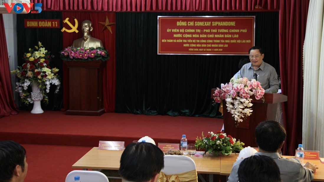 ກິດຈະການຫໍສະພາແຫ່ງຊາດ ລາວ ຕຶກໃໝ່ ໂດຍແມ່ທັບນ້ອຍ 11-ກະຊວງປ້ອງກັນປະເທດ ຫວຽດນາມ ປະຕິບັດການກໍ່ສ້າງດ້ວຍງົບປະມານກວ່າ 110 ລ້ານ USD. ໂດຍລາຍງານຕໍ່ກັບ ທ່ານ ສອນໄຊ ສີພັນດອນ, ທ່ານ ພັນເອກ ຫງວຽນຈຽນ, ຮອງຜູ້ບັນຊາການແມ່ທັບນ້ອຍ 11 ໃຫ້ຮູ້ວ່າ: ພາຍຫຼັງດຳເນີນກໍ່ສ້າງເປັນເວລາກວ່າ 2 ປີ , ກິດຈະການຫໍສະພາແຫ່ງຊາດ ລາວ ຕຶກໃໝ່ ໄດ້ສ້າງສຳເລັດໂດຍພື້ນຖານ; ວິສະວະກອນ, ກຳມະກອນກວ່າ 700 ຄົນ ຂອງກົມກອງພວມຮີບດ່ວນຕິດຕັ້ງບັນດາອຸປະກອນເຕັກນິກ, ປະດັບປະດາເຄື່ອງເຟີນີເຈີ… ທ່ານ ສອນໄຊ ສີພັນດອນ ໄດ້ຮັບຮູ້ບັນດາຂໍ້ສະເໜີແນະຂອງ ແມ່ທັບນ້ອຍ 11 ແລະ ຈະຊີ້ນຳບັນດາອົງການທີ່ມີໜ້າທີ່ຂອງ ລາວ ຄົ້ນຄ້ວາຕໍ່ຂໍ້ສະເໜີດັ່ງກ່າວ, ສ້າງເງື່ອນໄຂດີທີ່ສຸດໃຫ້ແກ່ກົມກອງໄດ້ມີແຫຼ່ງແຮງງານ, ວັດສະດຸ, ວັດຖຸດິບ ຢ່າງຄົບຖ້ວນເພື່ອຮັບໃຊ້ການກໍ່ສ້າງໂຄງການມີຄວາມຄືບໜ້າຖືກຕາມກຳນົດເວລາ, ບັນລຸຄຸນນະພາບດ້ານເຕັກນິກ, ຄວາມປານີດ, ສູ້ຊົນກໍ່ສ້າງໃຫ້ສຳເລັດ ແລະ ມອບຮັບກິດຈະການໃນໄຕມາດ 1 ປີ 2021.