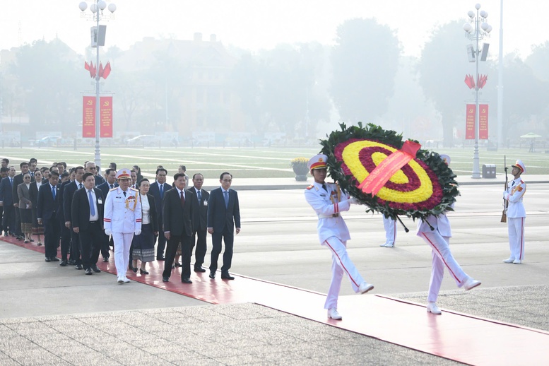 ທ່ານ ທອງລຸນ ສີສຸລິດ ເລຂາທິການໃຫຍ່ຄະນະບໍລິຫານງານສູນກາງພັກປະຊາຊົນປະຕິວັດລາວ, ປະທານປະເທດລາວ ພ້ອມດ້ວຍພັນລະຍາ ແລະ ຄະນະຜູ້ແທນຂັ້ນສູງພັກ, ລັດ ລາວ ເຂົ້າສຸສານວາງພວງມາລາໄຫວ້ອາໄລປະທານ ໂຮ່ຈີມິນ (ພາບ: VGP)