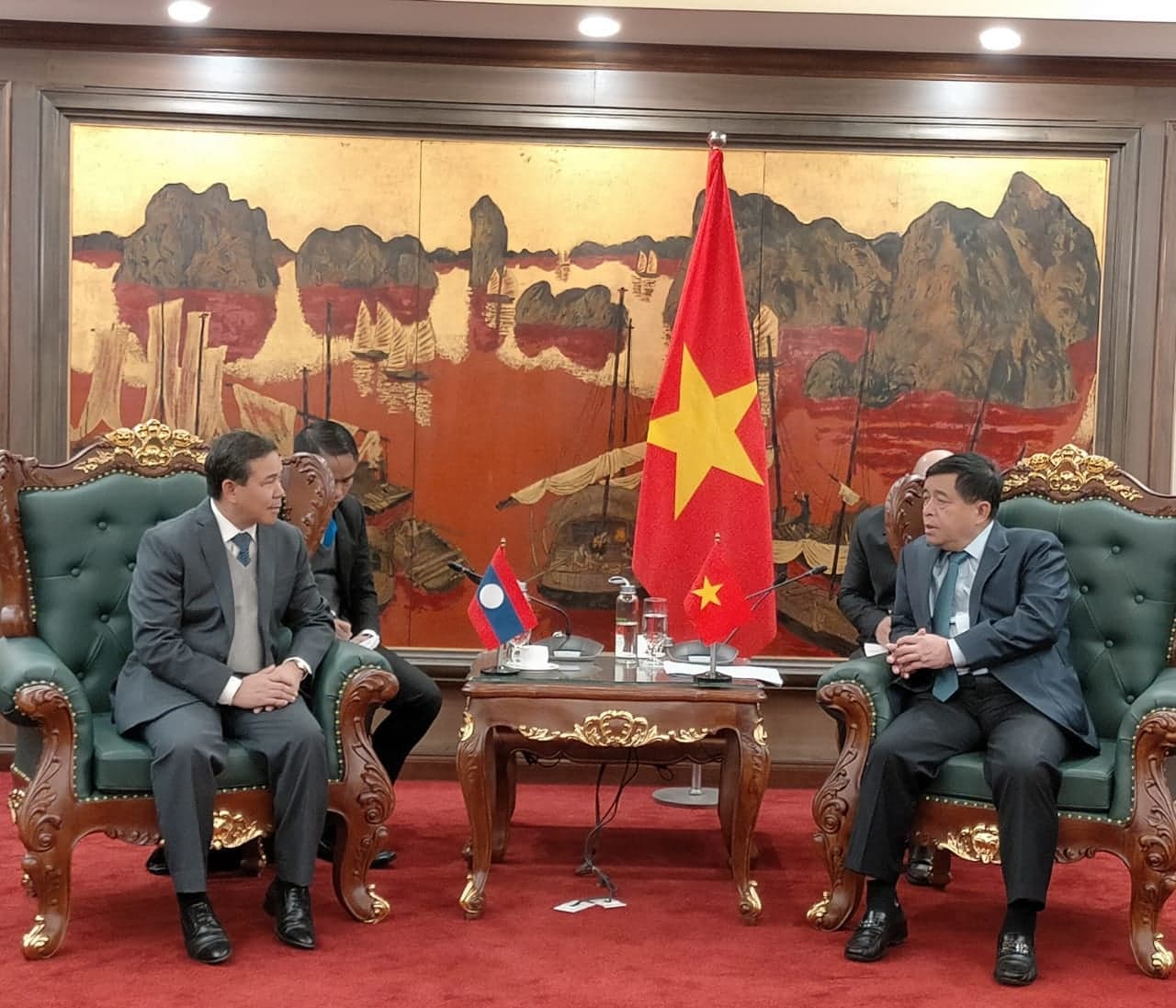 ທ່ານເອກອັກຄະລັດຖະທູດວິສາມັນຜູ້ມີອໍານາດເຕັມ ແຫ່ງ ສປປ ລາວ ປະຈໍາ ສສ ຫວຽດນາມ ເຂົ້າຢ້ຽມຂ່ຳນັບລັດຖະມົນຕີກະຊວງແຜນການ ແລະ ການລົງທຶນຫວຽດນາມ (ພາບ: ໂອລຳ) |